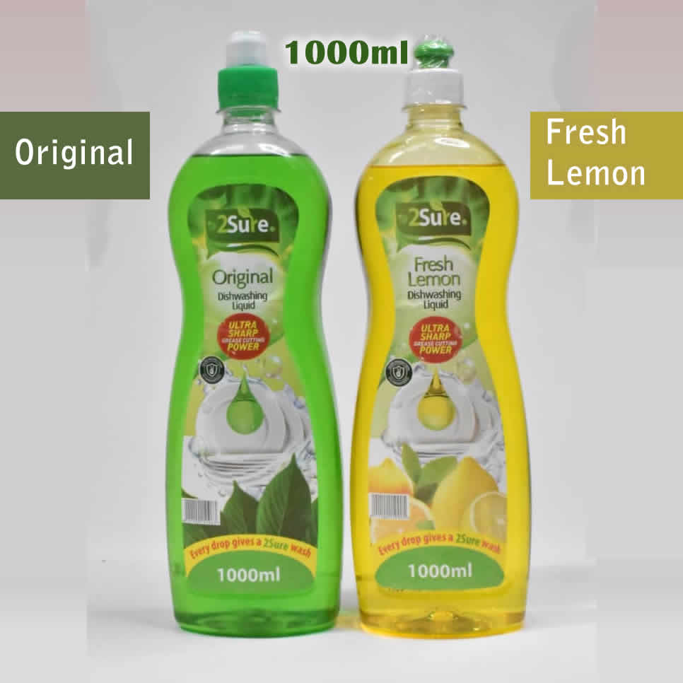 2Sure Dishwashing Liquid is a dishwashing detergent containing cleaning agents that help you in your daily dishwashing routine. With the combined cleaning power of 100 lemons, 2Sure Dishwashing Liquid easily removes grease, leaving your dishes shining bright and residue free. Thanks to the degreasing power of real lemon juice, this dishwashing liquid makes washing the dishes faster and easier and leaves a delicate lemon scent on your dishes. 2Sure Dishwashing Liquid is great for removing grease from your crockery, utensils, plastic and stainless-steel surfaces to achieve brilliant results. With 2Sure Dishwashing, Ultra Sharp Grease cutting Power!