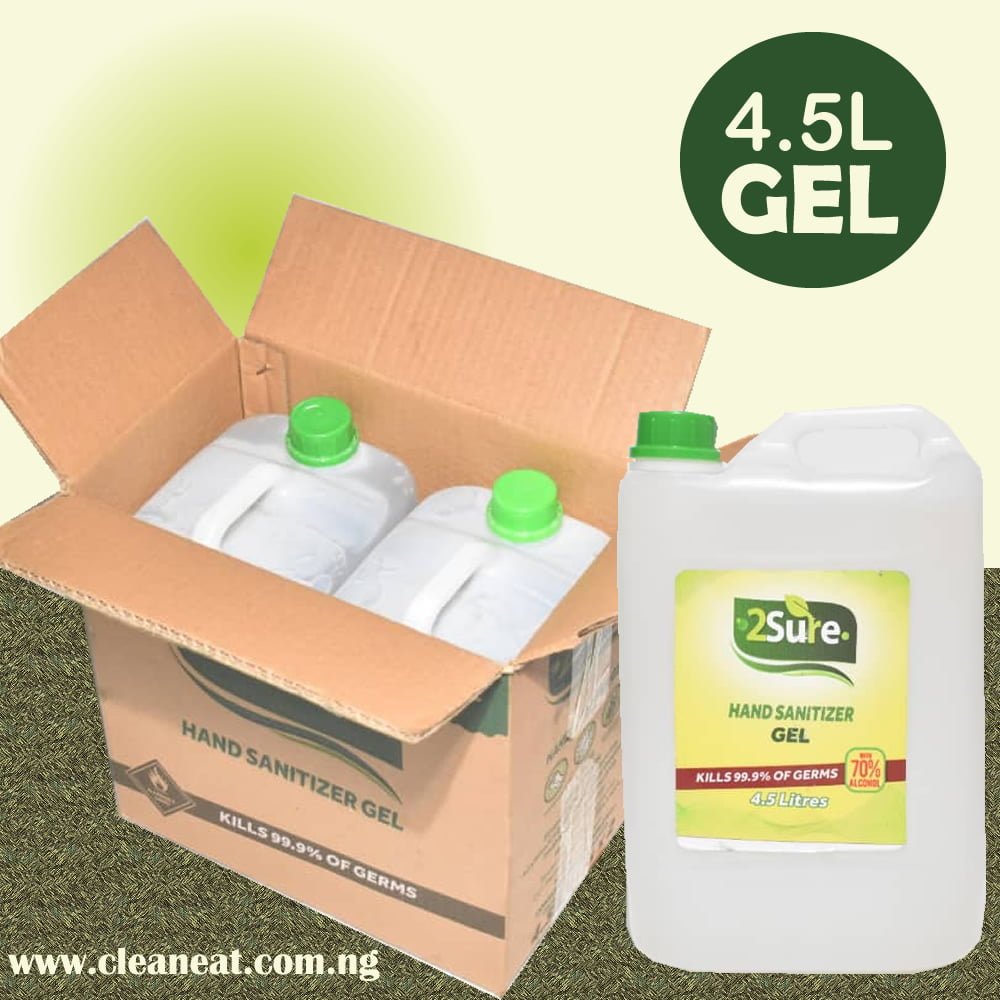 Buy bulk price for 1 carton of 4.5L 2Sure hand sanitizer Gel containing 2pieces. More discounts for higher quantities. The 2sure hand sanitizer contains 70% alcohol and kills 99.9 germs. 2sure hand and surface sanitizer is a product from 7up bottling company. It prevents germs infection by sanitizing the hands. Be 2sure! Stop germs!! Live well!