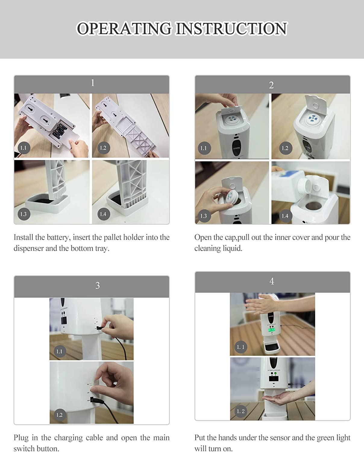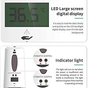 - NO CROSS -CONTAMINATION – You don’t have to touch anything about the liquid soap dispenser. Just put your hand under the nuzzle and the infrared induction sensor will activate the dispenser, thus automatically pump liquid sanitizer onto your palm. Put your wrist near the thermometer sensor on the top (no contact), and it will read your temperature instantly and accurately(hand temperature may be affected by washing and other factors).