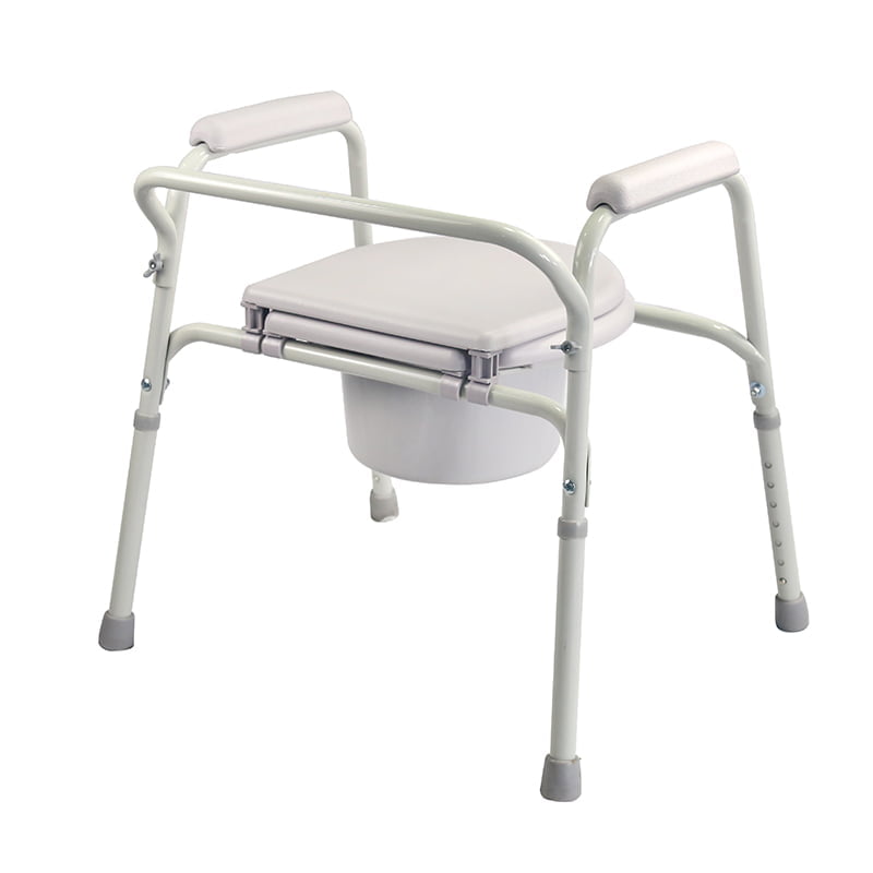 The plastic commode pail with lid is easily removable.