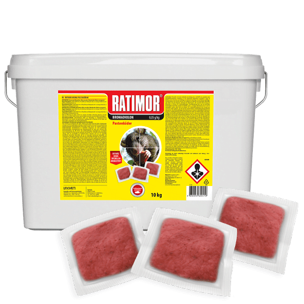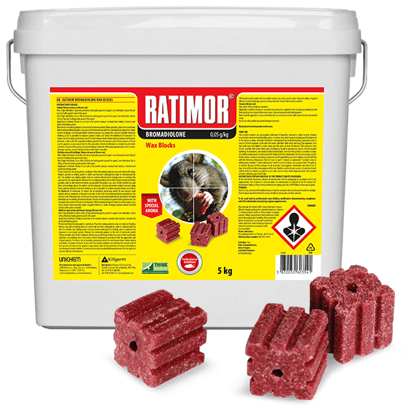 Ratimor Wax Blocks are effect rat killer rodenticide with the active ingredient bromadiolone, which is very popular with professional control operators because of its wide range of applications and high stability. The added wax (paraffin) provides moisture resistance and stability despite extreme temperature changes and direct sunlight. This makes it suitable for use in the outdoors, sewers, very damp spaces, etc. A delayed action ensures a large rodenticidal intake, as the poisoned animals perish a few days after ingestion and thus do not scare away other rodents before they ingest Ratimor Wax Blocks. The form and multiple edges provide an additional possibility – for monitoring purposes.