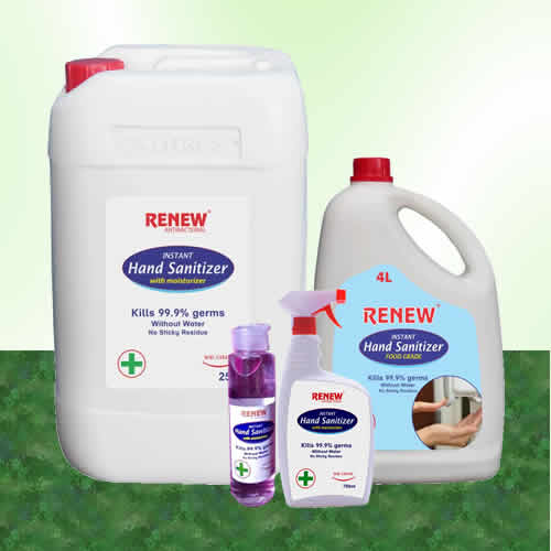 RENEW Anti-Bacterial Hand Sanitizer is a safe and convenient alternative to instantly cleanse your hands . Non sticky formula, leaves your hands feeling clean, fresh and germ-free. Kills over 99.99% of bacteria. Instant Results. No Water. No Towels. Comes in 100ml, 750ml, 4L and 25L