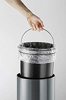 Stainless steel, pedal bin featuring a smooth, silent closing lid and an integrated handle. Waste bags can be fixed inside with a rubber band and the inner container can be removed easily via the handle. An anti-slip base ensures stability and a special coating prevents fingerprint marks. .