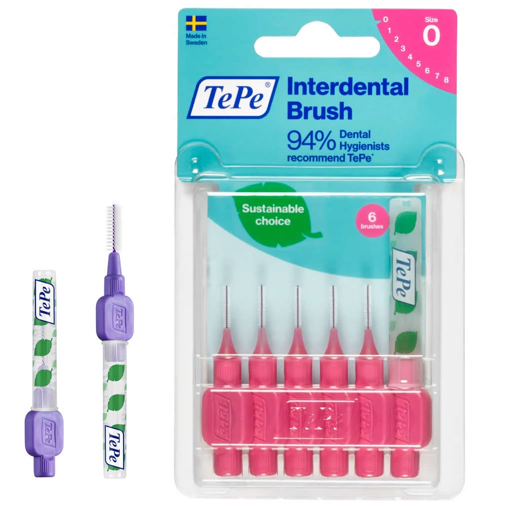 The TePe interdental brush is a small, easy-grip brush, devised especially for cleaning the gaps between your teeth and areas below the gum line, where a regular toothbrush cannot reach. The core of these special brushes is a metal wire with a plastic coating and filament which cover 98% of the wire. A cylindrically shaped brush with a rounded loop cleans your teeth thoroughly and gently. Each pack contains one travel cap that can be used also as a handle extension (you just need to stick it on the end of a brush handle).